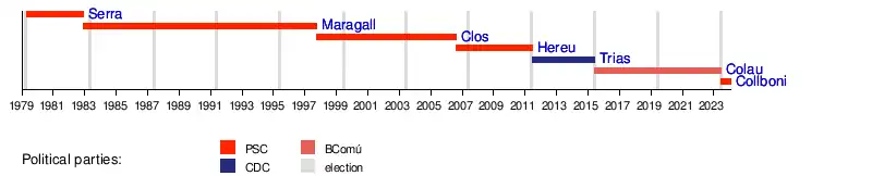 Barcelona City Council has had a total of 118 mayors since it was founded in 1835.[2] The first mayor of the city was José Mariano de Cabanes, who held office for six months, between November 1835 and April 1836. Among the mayors who have especially gone down in history, can be noted Francisco de Paula Rius i Taulet (promoting and holding the mayoralty at the Universal Exposition of 1888, during the Bourbon Restoration), Carles Pi i Sunyer (first mayor elected by universal suffrage, during the Second Republic), José María de Porcioles (mayor who held office the longest, during the Franco dictatorship), Narcís Serra (first mayor elected in the current democratic system), Pasqual Maragall (mayor who held office the longest in democracy as well as for promoting and holding the mayoralty in the 1992 Olympic Games) or Ada Colau (the first female mayor in the history of the city).