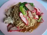 Wonton noodles (Thai: บะหมี่เกี๊ยว; bami kiao) are also very popular in Thailand, where, as in Malaysia and Singapore, the dish is often ordered together with barbecued pork which is then called bami mu daeng kiao (Thai: บะหมี่หมูแดงเกี๊ยว; mu daeng meaning "red pork").[14] As is customary with many noodle soups of Chinese origin in Thailand, chillies preserved in vinegar, dried chilli flakes, sugar, and fish sauce are added to taste. The dish is mostly eaten in soup form but it can also be served dry with the broth on the side.[15]