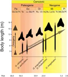 Another model of the evolution of this genus, also proposed by Casier in 1960, is that the direct ancestor of the Carcharocles is the shark Otodus obliquus, which lived from the Paleocene through the Miocene epochs, 60 to 13 Mya.[28][31] The genus Otodus is ultimately derived from Cretolamna, a shark from the Cretaceous period.[7][33] In this model, O. obliquus evolved into O. aksuaticus, which evolved into C. auriculatus, and then into C. angustidens, and then into C. chubutensis, and then finally into C. megalodon.
