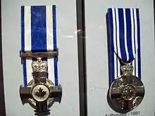 The Meritorious Service Decorations (French: Décorations pour service méritoire) are Canadian decorations awarded to those who have demonstrated an outstanding level of service or set an exemplary standard of achievement to benefit or honour Canada.[1] The decorations are available in two forms as the Meritorious Service Cross (Fr.: Croix du service méritoire) and the Meritorious Service Medal (Fr.: Médaille du service méritoire). The decoration, awarded to both Canadians and non-Canadians and available in both military and civilian divisions, is awarded by the reigning Canadian monarch (currently King Charles III) and presented on his behalf by the Governor General.