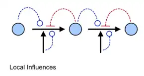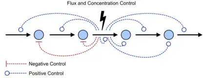 Control coefficients measure the effect of perturbations in an enzyme on a steady-state observable such as a flux or metabolite concentration. Note that the effect of a perturbation can be positive or negative depending on context. In the figure, a perturbation is assumed to be at step three. Figure modified and redrawn from[13]