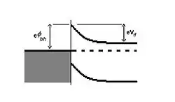 Band diagram of the contact point potential barrier at the interface of a metal and semiconductor. Shown are , the energy of the barrier, and , the maximum band bending in the semiconductor. (Figure adapted from H. Luth's Solid Surfaces, Interfaces, and Thin Films, p. 408 (see Refs.)
