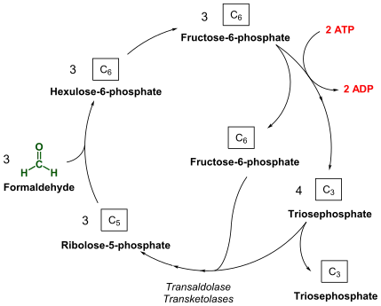 Under aerobic conditions, methanotrophs combine oxygen and methane to form formaldehyde, which is then incorporated into organic compounds via the serine pathway or the ribulose monophosphate (RuMP) pathway, and carbon dioxide, which is released. Type I and type X methanotrophs are part of the Gammaproteobacteria and they use the RuMP pathway to assimilate carbon. Type II methanotrophs are part of the Alphaproteobacteria and use the serine pathway of carbon assimilation. They also characteristically have a system of internal membranes within which methane oxidation occurs. Methanotrophs in Gammaproteobacteria are known from the family Methylococcaceae.[7] Methanotrophs from Alphaproteobacteria are found in families Methylocystaceae and Beijerinckiaceae.