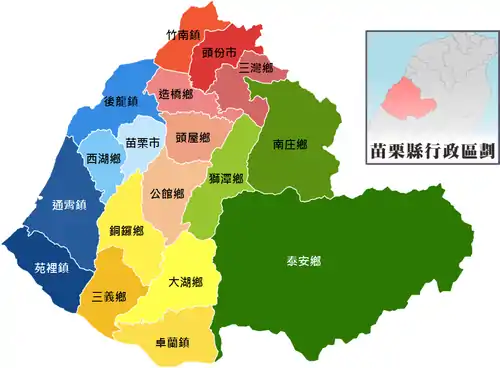 Miaoli County is divided into 2 cities, 5 urban townships, 10 rural townships and 1 mountain indigenous townships.[5][6] Miaoli County has the second highest number of urban townships after Changhua County. Miaoli City is the county seat which houses the Miaoli County Government and Miaoli County Council. The incumbent Magistrate of Miaoli County is independent Chung Tung-chin.