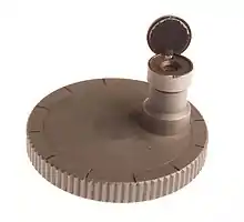 Improvement in technology since then has made even more miniaturization possible.[2] At the International Congress of Photography in Paris in 1925 Emanuel Goldberg presented a method of producing extreme reduction microdots using a two-stage process. First, an initial reduced negative was made, then the image of the negative was projected from the eyepiece of a modified microscope onto a collodium emulsion where the microscope specimen slide would be. The reduction was such that a page of text would be legibly reproduced in a surface of 0.01 mm2. This density is comparable to the entire text of the Bible fifty times over in one square inch. Goldberg's "Mikrat" (microdot) was prominently reported at the time in English, French and German publications.[3][4][5]