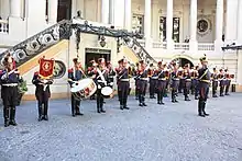 Cameroonian military bands solely follow the French precedent for military music and military bands. The Yaoundé based Music Band Company of the Cameroonian Armed Forces under the baton of Captain Florent Essimbi is the main military band of the country. The band was founded in 1959, a year before Cameroon gained its independence, as purely a brass band company. Because of its increase in musicians it was upgraded to a musical section 10 years later. It has retained its current name since 2004. The band currently and has previously relied on its cooperation with the French Military and specifically its connections to musicians from the Conservatoire national supérieur de musique et de danse de Lyon.[13] Other band include the Musique du Carroussel spécial de l'armée, the Musique de la Garde Présidentielle[14] and the Musique de la gendarmerie.