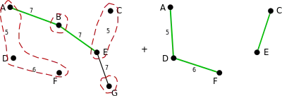 In the following example green edges are used to form a MBST and dashed red areas indicate super vertices formed during the algorithm steps.