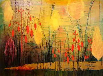 Working with imagery from the natural world, Lehr creates layered abstract compositions with unconventional materials. 60 Minutes correspondent Morley Safer referred to her as "the mistress of light".[8] The lush flora of her Florida home has a profound influence on her aesthetic vocabulary. Lehr seeks to express the natural world's essence and patterns, so that her artwork expresses the reality of nature better than a naturalistic rendering.[5] On closer inspection, they reveal a myriad of contrasts — natural imagery with abstract gesture, dense planes with translucent washes, and rich, abraded textures with a crisp, contemporary structure.[1] Art historian Irving Sandler describes her use of imagery thus: “What makes Lehr's work different is the specificity of her references to nature. I was trying to think of any other artist working in this tradition who did it quite as explicitly as Mira did and I couldn’t come up with one."[8]