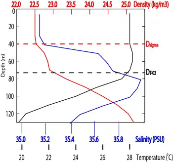 In the past, a typical criterion for MLD was the depth at which the surface temperature cools by some change in temperature from surface values. For example, Levitus[5] used 0.5 °C. In the example to the right, 0.2 °C is used to define the MLD (i.e. DT-02 in the Figure). Prior to the abundant subsurface salinity available from Argo, this was the main methodology for calculating the oceanic MLD. More recently, a density criterion has been used to define the MLD. The density-derived MLD is defined as the depth where the density increases from the surface value due to a prescribed temperature decrease of some value (e.g. 0.2 °C) from the surface value while maintaining constant surface salinity value. (i.e. DT-02 - Dsigma).