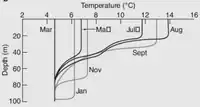 Formation of a mixed layer in a lake is similar to that in the ocean, but mixing is more likely to occur in lakes solely due to the molecular properties of water. Water changes density as it changes temperature. In lakes, temperature structure is complicated by the fact that fresh water is heaviest at 3.98 °C (degrees Celsius). Thus in lakes where the surface gets very cold, the mixed layer briefly extends all the way to the bottom in the spring, as surface warms as well as in the fall, as the surface cools. This overturning is often important for maintaining the oxygenation of very deep lakes.
