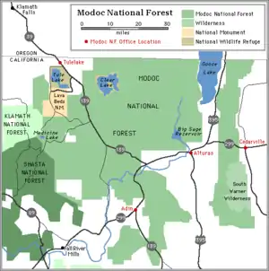 Modoc National Forest was established as the Modoc Forest Reserve on November 29, 1904, by the United States General Land Office. It was named for the Modoc people who traditionally had their territory in this area. In 1905 federal forests were transferred to the U.S. Forest Service, and on March 4, 1907, they became National Forests. On July 1, 1908 Warner Mountains National Forest was added to Modoc.[2] The South Warner Wilderness lies within the forest.
