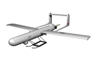The Mohajer-3, also known as the Dorna, was designed with a new airframe for better performance.[17] It had a square body and featured a low-mounted horizontal stabilizer flush with the main wing, the only member of the Mohajer family configured this way.[17] The Mohajer-3 could be fitted with fixed landing gear, for a runway takeoff, or with skids for a JATO launch.[17] It was recovered by parachute or skid landing.[17] It was powered by an unidentified 25 hp (18.6 kW) piston engine.[2] The Mohajer-3 was announced in 1999.