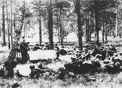 Troops garrisoned in Chișinău were also targeted by partisan attacks, beginning when Valerian Trikolich threw a grenade at a Romanian battery in Pushkin Park.[16] Sabotage was also reported during the early days of occupation, with workers burying the industrial equipment at Chișinău ceramic tiles factory, or setting fire to the city's soap factory.[18] Some groups were formed that were largely independent of the PCM—groups espousing Soviet patriotism, and sometimes manned by Komsomol youth, were established at Berlinți, Beleavinți, and Sîngerei, while Jews in Briceni formed a self-defense unit which prevented a pogrom. The latter group, comprising 47 people, was involved in a shootout with Romanian troops on 22 July.[19]