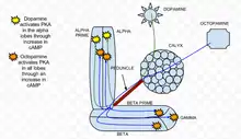 Protein kinase A (PKA) has been found to play an important role in learning and memory in Drosophila.[33] When calcium enters a cell and binds with calmodulin, it stimulates adenylate cyclase (AC), which is encoded by the rutabaga gene (rut).[34] This AC activation increases the concentration of cAMP, which activates PKA.[34] When dopamine, an aversive olfactory stimulant, is applied it activates PKA specifically in the vertical mushroom body lobes.[34] This spatial specificity is regulated by the dunce (dnc) PDE, a cAMP-specific phosphodiesterase. If the dunce gene is abolished, as found in the dnc mutant, the spatial specificity is not maintained. In contrast, an appetitive stimulation created by an octopamine application increases PKA in all lobes.[34] In the rut mutant, a genotype in which the rutabaga is abolished, the responses to both dopamine and octopamine were greatly reduced and close to experimental noise.