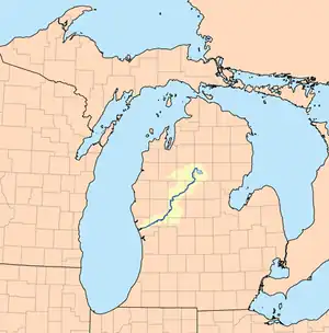 The Muskegon River (/məˈskiːɡən/ mə-SKEE-gən) is a river in the western portion of the lower peninsula of the U.S. state of Michigan. The river source is located at Houghton Lake in Roscommon County, flowing out of the North Bay into neighboring Missaukee County. The river passes through Clare County, Osceola County, Mecosta County, Newaygo County, and Muskegon County, and generally flows southwesterly to its mouth at Muskegon, Michigan, where it empties into Muskegon Lake. Muskegon Lake is connected to Lake Michigan via a mile-long channel. The river has several major branches, such as the Hersey River, Cedar Creek and Little Muskegon River. The primary river channel is 216 miles (348 km) long[1] and drains an area of 2,350 square miles (6,100 km2).[2] In September 2002, an article in National Geographic raised concerns about a controversial deal made with Nestlé Waters North America, giving them permission "to bottle up to 210 million gallons (about 800 million liters) a year from an aquifer north of Grand Rapids, Michigan that recharges the Muskegon River".[3]