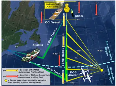 NAAMES was led by scientists from Oregon State University and the National Aeronautics and Space Administration (NASA). They conducted four field campaigns from 2015-2018 that were designed to target specific phases of the annual phytoplankton cycle: minimum, climax, intermediary decreasing biomass, and increasing intermediary biomass.[1] The campaigns were designed to observe each unique phase, in order to resolve the scientific debates on the timing of bloom formations and the patterns driving annual bloom re-creation. The NAAMES project also investigated the quantity, size, and composition of aerosols generated by primary production in order to understand how bloom cycles affect cloud formations and climate.[2] Scientists employed multiple complementary research methods, including intensive field sampling via research ships, airborne aerosol sampling via airplane, and remote sensing via satellites.