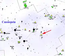 NGC 7789 (also known as Caroline's Rose[4] or the White Rose Cluster) is an open cluster in Cassiopeia that was discovered by Caroline Herschel in 1783. Her brother William Herschel included it in his catalog as H VI.30. This cluster is also known as the "White Rose" Cluster or "Caroline's Rose" Cluster because when seen visually, the loops of stars and dark lanes look like the swirling pattern of rose petals as seen from above.