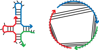 The secondary structure of multiple interacting strands is defined by a list of base pairs.[3] A polymer graph for a secondary structure can be constructed by ordering the strands around a circle, drawing the backbones in succession from 5’ to 3’ around the circumference with a nick between each strand, and drawing straight lines connecting paired bases. A secondary structure is pseudoknotted if every strand ordering corresponds to a polymer graph with crossing lines. A secondary structure is connected if no subset of the strands is free of the others. Algorithms are formulated in terms of ordered complexes, each corresponding to the structural ensemble of all connected polymer graphs with no crossing lines for a particular ordering of a set of strands. The free energy of an unpseudoknotted secondary structure is calculated using nearest-neighbor empirical parameters for RNA in 1M Na+[4][5] or for DNA in user-specified Na+ and Mg++ concentrations;[6][7][8] added parameters are employed for the analysis of pseudoknots (single RNA strands only).[9][10]