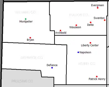 For the 1969–70 school year, the Northern Border League was formed by the smaller-enrollment members of the NWOAL as a way to compete for league titles without Napoleon and Bryan.[25] Delta and Swanton withdrew from the NWOAL completely while Archbold, Liberty Center, Montpelier, Wauseon and the recently joined Evergreen become dual members of both the NBL and the now 7-member NWOAL.[5] Patrick Henry would also compete in the NBL after consolidating for the 1969–70 school year, although their football team wouldn't begin NBL play until 1970. Competition between the five dual-league members counted in the standings for both the NWOAL and the NBL.