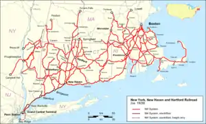 An initial merger attempt between the two in 1870 was rejected by the Connecticut General Assembly, largely over fears that the merged railroad would form a monopoly.[5] But the legislature approved a second attempt just two years later, and the New York, New Haven and Hartford Railroad was formed on July 24, 1872.[6][7] The newly-combined railroad owned a main line from New York City to Springfield via New Haven and Hartford, and also reached New London, Connecticut via a lease of the Shore Line Railway (leased in 1870 by the New York and New Haven Railroad).[8]