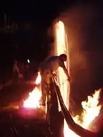 The village is particularly famous for hitoboshi (火とぼし), the two-day local fire festival, the largest in the prefecture.[6] Many people who have moved away but still have family in the village return for this festival, and it is popular with tourists as well. Though such fire festivals were once popular, few remain. Nanmoku's version falls on August 14 and 15, and coincides with Obon, a festival honoring ancestors. However, Hitoboshi itself commemorates the village's victorious alliance with the Takeda clan during the Sengoku period.[7] During the festival, villagers take turns standing on a bridge and twirling burning bales of hay over the edge.