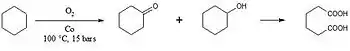 An oxidation reaction to form adipic acid is shown in figure 3 and it can be catalyzed by cobalt nanoparticles.[5] This is used in an industrial scale to produce the nylon 6,6 polymer. Other examples of oxidation reactions that are catalyzed by metallic nanoparticles include the oxidation of cyclooctane, the oxidation of ethene, and glucose oxidation.[5]