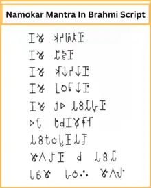 A short inscription (dated 200 BCE to 100 BCE) found in Pale Caves in Maharashtra mentions Namo Arahatanam (नमो अरहतानं) or Namo Arahantanam (नमो अरहंतानं), only the first line of Namokara Mantra. In Kushana and Shaka periods of 1st century CE to the first quarter of 2nd century, only the first line was prevalent.[3] The Hathigumpha inscription dated between 2nd century BCE to 1st century CE starts with Namo Arahantanam (नमो अरहंतानं) and Namo Save Sidhanam (नमो सवे सिधानं), the first two lines of Namokar Mantra. The rest of the lines are not there. It was inscribed by the Jain monarch Kharavela of Kalinga kingdom.[3][4][5] According to historian M. A. Dhaky, these two lines were originally used as mangala (auspicious opening lines) in written works and rituals then.[3]