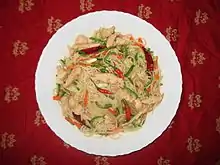 Nepali cuisine comprises a variety of cuisines based upon ethnicity, alluvial soil and climate relating to cultural diversity and geography of Nepal and neighboring regions of Sikkim and Gorkhaland. Dal-bhat-tarkari (Nepali: दाल भात तरकारी) is eaten throughout Nepal. Dal is a soup made of lentils and spices, bhat — usually rice but sometimes another grain — and a vegetable curry, tarkari. Condiments are usually small amounts of spicy pickle (achaar, अचार) which can be fresh or fermented, mainly of dried mustard greens (called gundruk ko achar) and radish (mula ko achar) and of which there are many varieties.[1] Other accompaniments may be sliced lemon (nibuwa) or lime (kagati) with fresh green chilli (hariyo khursani) and a fried papad and also Islamic food items like rice pudding, sewai, biryani etc. Dhindo (ढिंडो) is a traditional food of Nepal. A typical example of Nepali cuisine is the Chaurasi Byanjan (Nepali: चौरासी व्यञ्जन) set where bhat (rice) is served in a giant leaf platter (patravali) along with 84 different Nepali dishes each served on small plates.[2] It is mostly fed during weddings and Pasni(rice feeding ceremony).