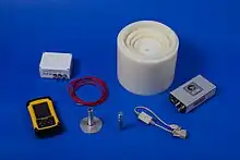 The NNS operates under the same principle as a Bonner sphere neutron spectrometer.[2] The sensitive part of the spectrometer is the Helium-3 proportional counter, which detects neutrons through the reaction 3He(n,p)3H. This particular reaction has a significant cross-section only at thermal neutron energies. In order for a higher energy neutrons to be detected their energies must be decreased, or "moderated". To slow down neutrons at higher energies the NNS uses different amounts of high-density polyethylene (HDPE). The He-3 proportional counter is surrounded by varying amounts of HDPE to sample various energy regions of the neutron field. The standard NNS has seven HDPE cylinders which are nested together, similar to Russian nesting dolls, to measure neutrons of higher and higher energies.