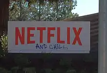 - ↑ O'Neil, Lauren (6 November 2015). "Somebody tagged a sign at Netflix headquarters with 'and chill'". CBC News. Retrieved 14 November 2015.