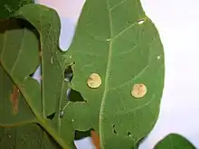 The normally cream coloured saucer of the smooth spangle gall has a small cone elevated in its centre, a pronounced rim and they are sometimes found almost folded in two.[2] The gall may have streaks of purple, red or other colours through it. Typically found on the lower surface, this gall is found more often on the upper surface than other spangle galls and although often grouped together, the numbers on each leaf are far fewer than in species such as Neuroterus quercusbaccarum. The gall is observed to swell appreciably once it has detached and fallen in late autumn. The gall has also been recorded as green, purple, red or pink.[1]