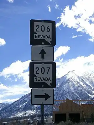Signs along SR 206 approaching the junction of State Route 207, with Jobs Peak of the Carson Range in the background