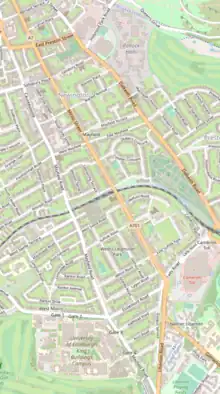 The high ground of northern Newington affords views of Arthur's Seat to the east and of Liberton and the countryside of Midlothian to the south.[9][32][99] Despite mature tree growth throughout as well as a number of roadside "nature strips" and communal private gardens, the only public park is a small area around the Braid Burn at the southern tip of Newington.[100] The green space of East Preston Street Burial Ground interrupts development of northern Newington while Newington Cemetery forms a prominent landscape feature at the south-eastern edge of the district.[101][102]