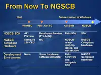 NGSCB was among the topics discussed during Microsoft's PDC 2003 with a pre-beta software development kit, known as the Developer Preview, being distributed to attendees.[10] The Developer Preview was the first time that Microsoft made NGSCB code available to the developer community and was offered by the company as an educational opportunity for NGSCB software development.[66] With this release, Microsoft stated that it was primarily focused on supporting business and enterprise applications and scenarios with the first version of the NGSCB scheduled to ship with Windows Vista, adding that it intended to address consumers with a subsequent version of the technology, but did not provide an estimated time of delivery for this version.[8][66] At the conference, Jim Allchin said that Microsoft was continuing to work with hardware vendors so that they would be able to support the technology,[67] and Bill Gates expected a new generation of central processing units to offer full support.[68] Following PDC 2003, NGSCB was demonstrated again on prototype hardware during the annual RSA Security conference in November.[69]
