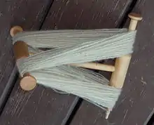 A niddy-noddy[1] is a tool used to make skeins from yarn. It consists of a central bar, with crossbars at each end, offset from each other by 90°. The central bar is generally carved to make it easier to hold.[2] Either one of the crossbars will have a flat edge to allow the skein to slide off, or will be completely removable. Niddy-noddies can be constructed of many different materials including wood, metal, and plastic. Wood is traditional, and most quality niddy-noddies are still made of wood. Budget spinners occasionally use niddy-noddies made from PVC pipes.