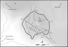 From excavations begun in 1901 it seems clear that the remains now visible on the site are entirely Roman.[4] The well-preserved walls are in the polygonal style, over 2.5 km in circuit, and are entirely embankment walls, not standing free above the internal ground level. The walls enclose an area of approximately 38 hectares. Remains of two towers, and of several gateways (notably the Porta Maggiore, defended by a tower), exist. The bastion at the Porta Maggiore still stands to 13 m. A square tower, referred to as "La Loggia" is also to be found along the curtain.[5][6]