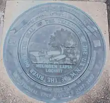 Seal of the Northwest Territory over a time capsule outside the Campus Martius Museum. The Latin phrase, "He has planted one better than the one fallen," signifies the replacement of wilderness by civilization.[39]