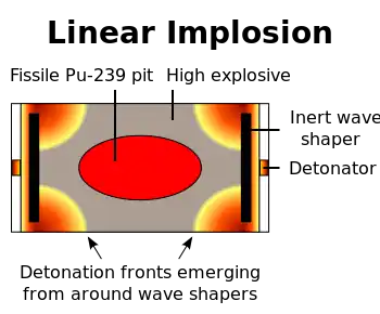 In the two-point linear implosion, the nuclear fuel is cast into a solid shape and placed within the center of a cylinder of high explosive. Detonators are placed at either end of the explosive cylinder, and a plate-like insert, or shaper, is placed in the explosive just inside the detonators. When the detonators are fired, the initial detonation is trapped between the shaper and the end of the cylinder, causing it to travel out to the edges of the shaper where it is diffracted around the edges into the main mass of explosive. This causes the detonation to form into a ring that proceeds inward from the shaper.[23]