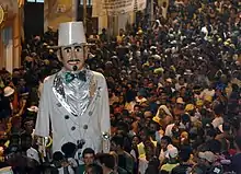 Other characters have been created in association to Homem da Meia-Noite. A Mulher do Dia (Portuguese for 'The Day Woman') was created in 1967.[4] The doll only parades on Sunday, thus only meets Homem da Meia Noite when all giant dolls parade together. The figure was created by the craftsman Julião das Máscaras, whom inspired at Monalisa. It has long dark hair, a gold tooth smile, and wears yellow and blue in a reference to Yemọja e Oshun. Homem and Mulher were "officially" married in a ceremony in February 1990.[5]