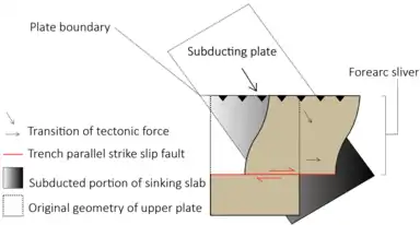 Strong and continuing tectonic force in trench parallel direction leads to the development of trench parallel strike slip fault system.[27] The fault thus separate a portion of the forearc from the overriding plate, forming the forearc sliver.[27]