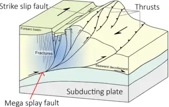 In Nankai Trough (Formed by oblique subduction of the Philippine Sea Plate),[22] seismic profiles reveal that the margin parallel strike slip fault and thrust structures are linked by the mega splay fault system, which align in a parallel manner with the subducting plate (i.e. Philippine Sea Plate).[21] | |