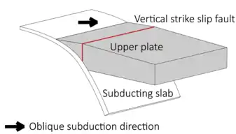 During oblique subduction, the convergence and coupling between two plates create horizontal shear stress on the overriding plate.[10] Early studies suggested that horizontal shear is likely to concentrate in vertical planes.[10] Together with the field measurements on seismicity.[10] The trench parallel strike slip fault is thought to be vertical from earth surface down to the subducting plate.[10] |