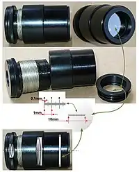 An ocular micrometer or eyepiece micrometer is a glass disk, engraved with a ruled scale, that fits in an eyepiece of a microscope,[1][2] which is used to measure the size of microscopic objects through magnification under a microscope. When the eyepiece micrometer is calibrated using a stage micrometer, the length of the divisions on the scale depends on the degree of magnification.[3]