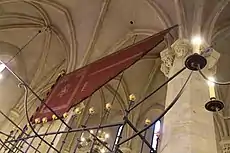 An unusual feature found in the nave of this synagogue is a large red flag near the west pillar. In the centre of the flag is a Star of David and in the centre of the star is a "Jewish hat." Both the hat and star are stitched in gold. Also stitched in gold is the text of Shema Yisrael. Ferdinand III, Holy Roman Emperor awarded the Jewish community their own banner in recognition for their services in the defence of Prague during the Thirty Years War. The banner now on display is a modern reproduction.