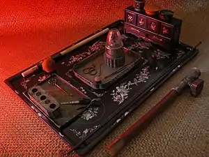 An opium pipe is a pipe designed for the evaporation and inhalation of opium. True opium pipes allow for the opiate to be vaporized while being heated over a special oil lamp known as an opium lamp. It is thought that this manner of "smoking" opium began in the seventeenth century when a special pipe was developed that vaporized opium instead of burning it.[1]