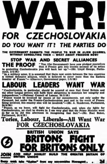Throughout the British Empire pacifists were jailed for expressing antiwar sentiment.[8] Also Oswald Mosley and his British Union of Fascists were opposed to war, believing that another world war against Germany was not in Britain's national interest and that Britons should "fight for Britain alone".[9] Editorials and cartoons in Action often asserted that the British Empire needed to prepare for a defensive war against Japan and that war with Germany would put Britain's interests in Asia in jeopardy. Mosley devoted all of the party's efforts to the "Peace Campaign", calling for a referendum on the continuation of the war and advocating a negotiated peace treaty with Germany. The campaign ended after Mosley and many other senior BUF members were interned under Defence Regulation 18B in May 1940.[10]