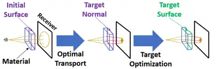 There have been many different approaches to address the continuous problem. One approach uses an idea from transportation theory called optimal transport[10] to find a mapping between incoming light rays and the target surface. After obtaining such a mapping, the surface is optimized by adapting it iteratively using Snell's law of refraction.[11][12]