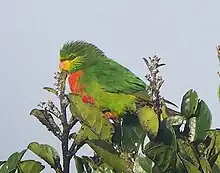 Other than the yellow-billed lorikeet, no other parrot in the species' range has a similar coloration.[11] Compared with the yellow-billed lorikeet, it is smaller in size, has more richly coloured plumage, and has a smaller, orange bill.[5] Additionally, it can also be distinguished by its flanks and wings being the same shade of green, the underside of the tail being dull green with red at the base, and the lack of an olive tint to the top of its head.[11]