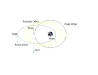 Transfer orbits are usually elliptical orbits that allow spacecraft to move from one (usually substantially circular) orbit to another. Usually they require a burn at the start, a burn at the end, and sometimes one or more burns in the middle.