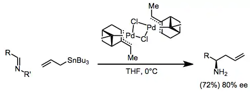 Imines are less reactive than the corresponding aldehydes, but palladium catalysis can be used to facilitate addition into imines.[14] The use of iminium ions as electrophiles has also been reported.[15]